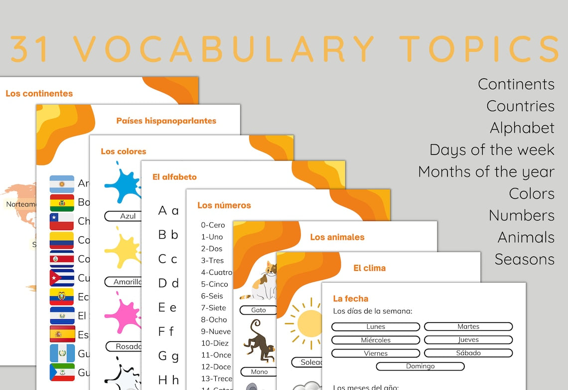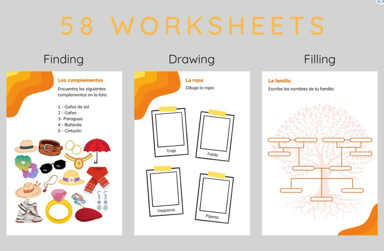 Start learning and practicing Spanish with 31 essential vocabulary topics and 58 engaging worksheets. Perfect for all ages—use it digitally or print it out for hands-on practice1
